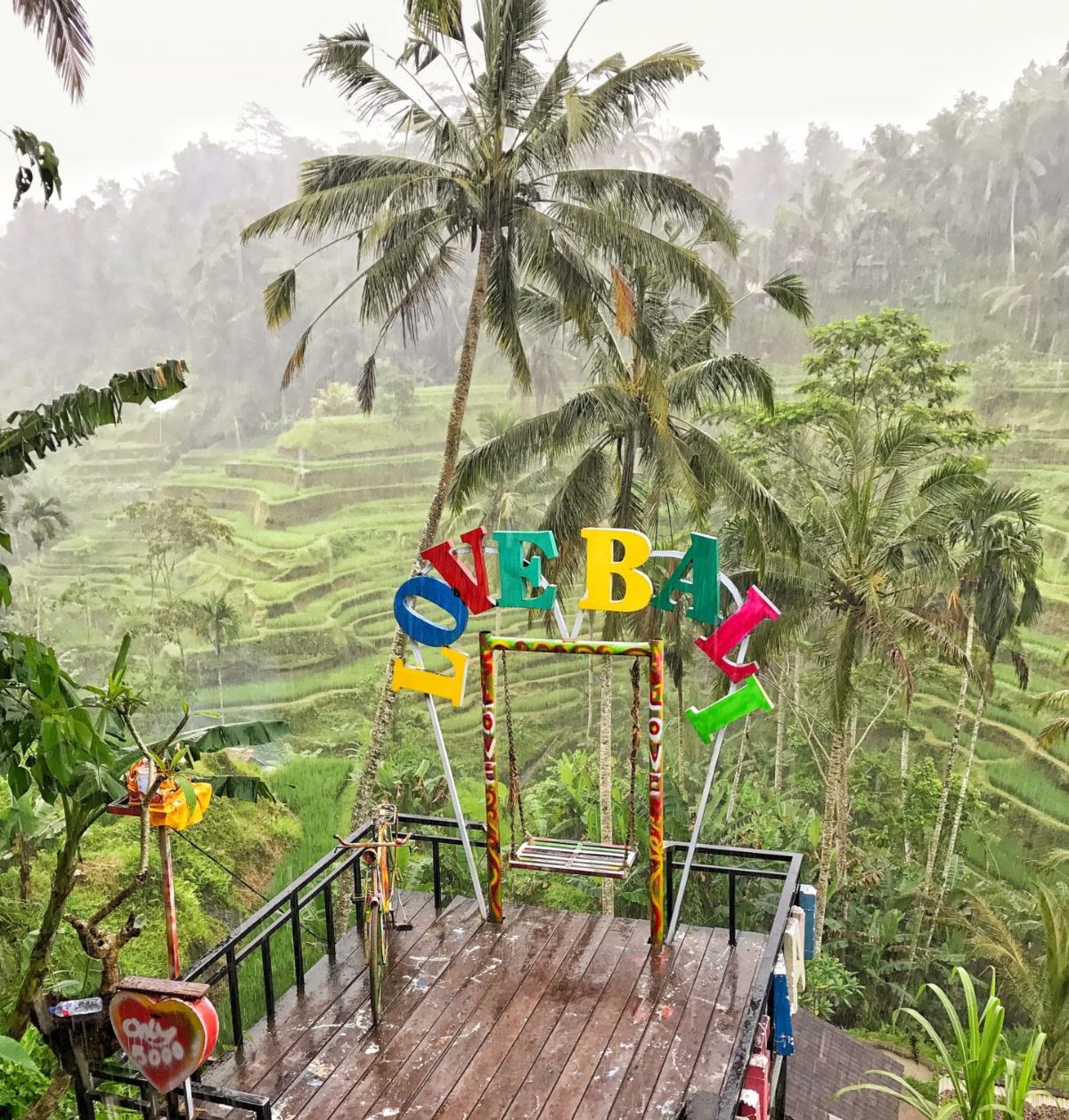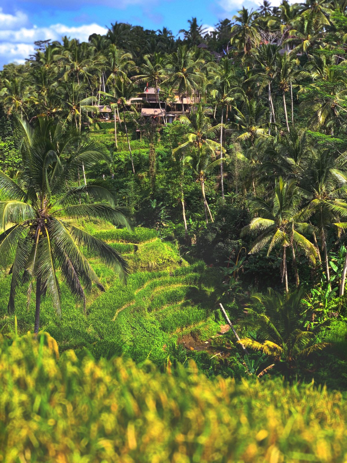 Standing 600 meteres above sea level, the Tegallalang Rice Terraces in Ubud is famous for its beautiful scenes of rice paddies involving the subak (traditional Balinese cooperative irrigation system), which according to history, was passed down by a revered holy man named Rsi Markandeya in the eighth century. Tegallalang forms the three most splendid terraced landscapes in Ubud's shared region, with the others being in the villages of Pejeng and Campuhan.